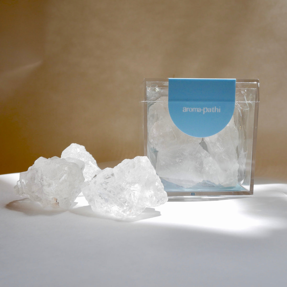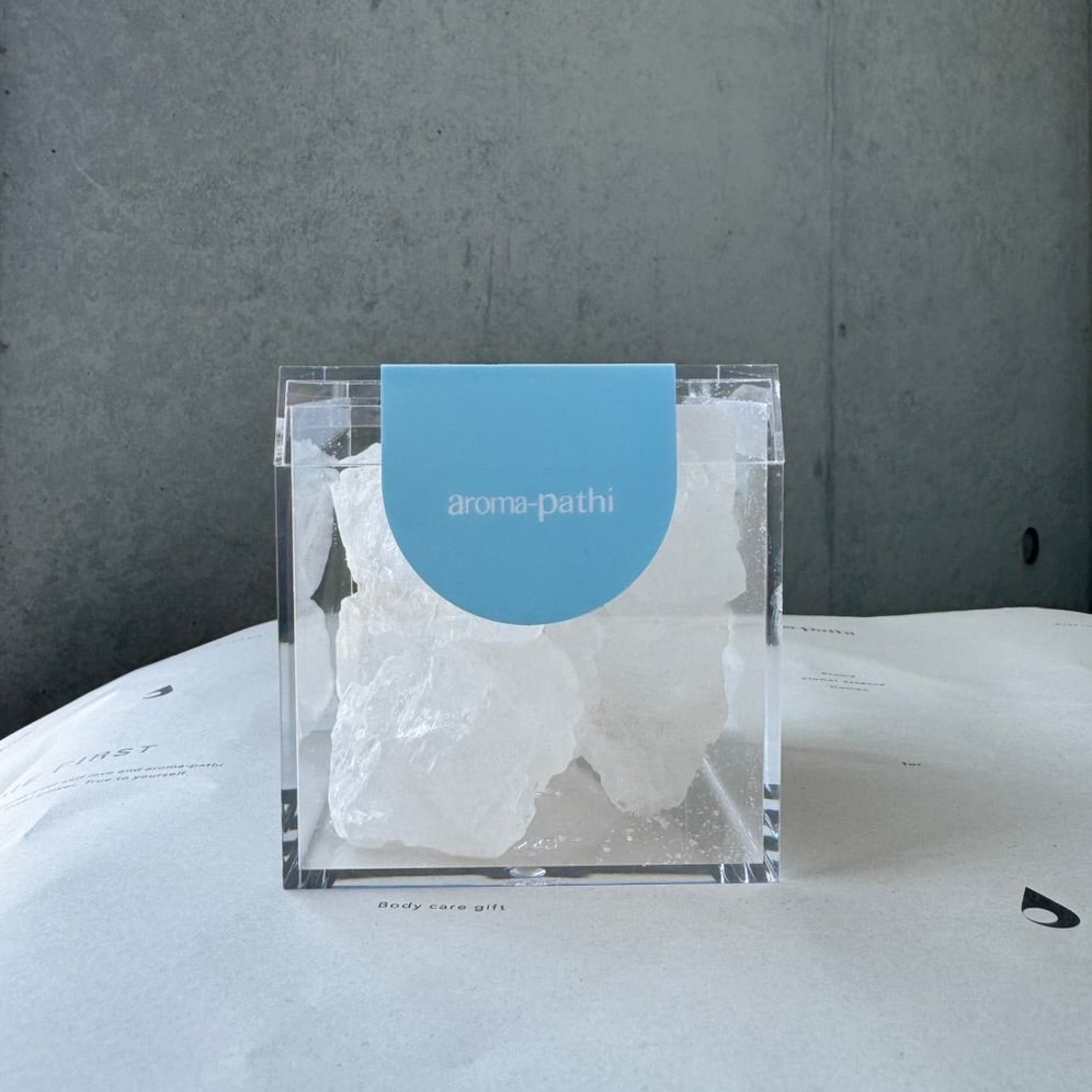 The clear salt and blue label, beautifully presented in a transparent box, will help clear your thoughts.