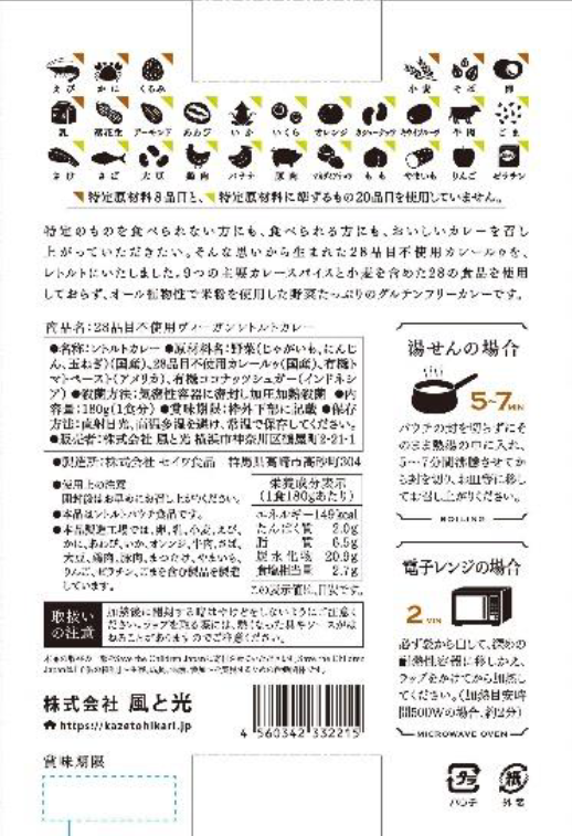 We do not use the nine main curry spices—fennel, cumin, dill, caraway, anise, coriander, fenugreek, chili pepper, and sage—nor 28 other common allergens, including wheat, shrimp, crab, walnuts, buckwheat, eggs, milk, peanuts, almonds, abalone, squid, salmon roe, oranges, cashew nuts, kiwi, beef, sesame, salmon, mackerel, soybeans, chicken, bananas, pork, macadamia nuts, peaches, yams, apples, or gelatin.
