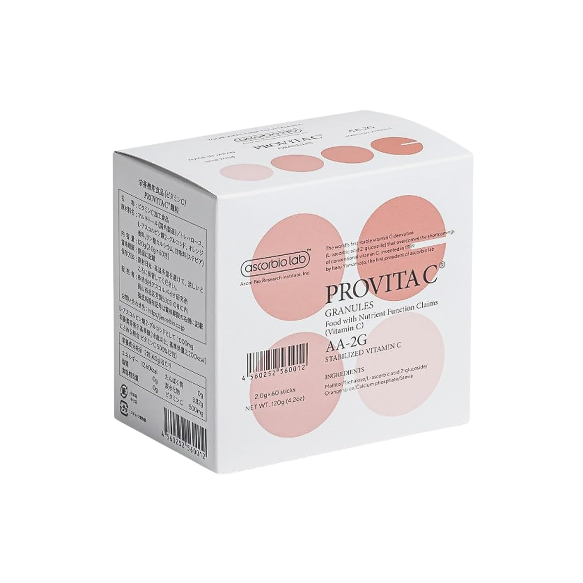 Vitamin C is an essential nutrient vital to our bodies. However, it is highly unstable when exposed to heat, light, or air, and has the drawback that even large amounts ingested are excreted in urine within 2 to 3 hours. To address this, the late Dr. Katsuhiko Yamamoto, founder of AscorBio Research Institute and Professor Emeritus at Okayama University, developed the vitamin C derivative "AA-2G" in 1989. This derivative remains stable even in aqueous solutions. PROVITA C Granules contain this AA-2G.