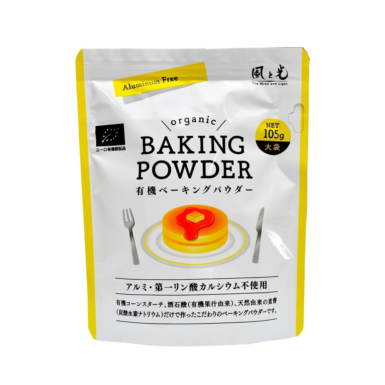 Este polvo para hornear está elaborado exclusivamente con jugo de fruta concentrado orgánico, almidón de maíz orgánico y bicarbonato de sodio. No contiene aluminio, ya que no contiene alumbre quemada ni fosfato monobásico de calcio.