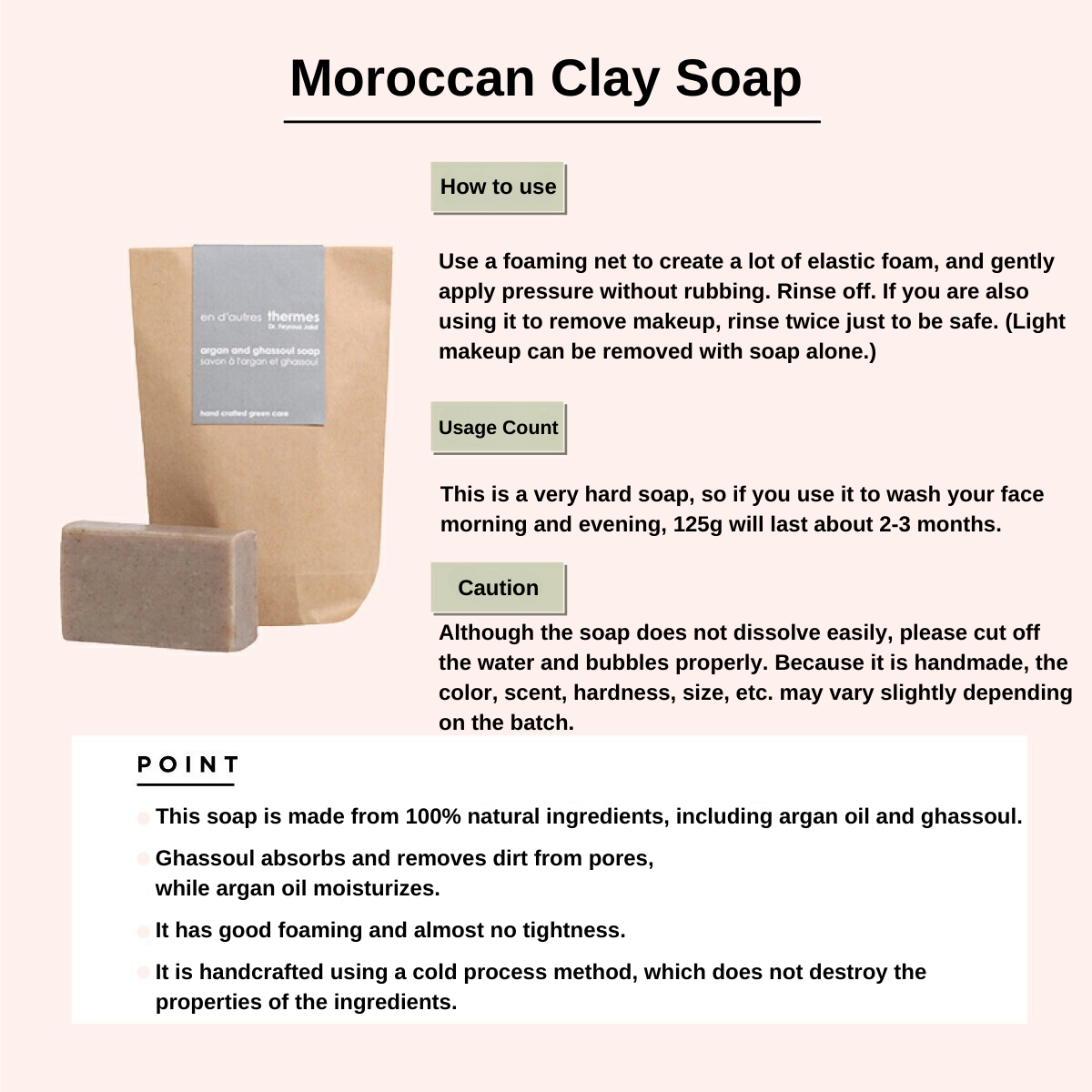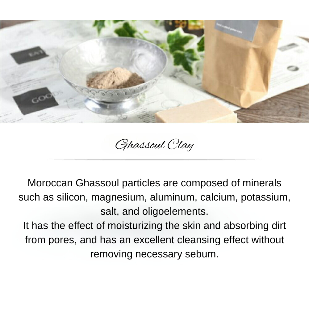 El ghassoul es una arcilla que se encuentra exclusivamente en Marruecos y que las mujeres bereberes y árabes de la zona han utilizado desde hace mucho tiempo para limpiar el cabello y el cuerpo. Es rico en minerales e hidrata la piel, a la vez que absorbe la suciedad de los poros y reduce la inflamación.