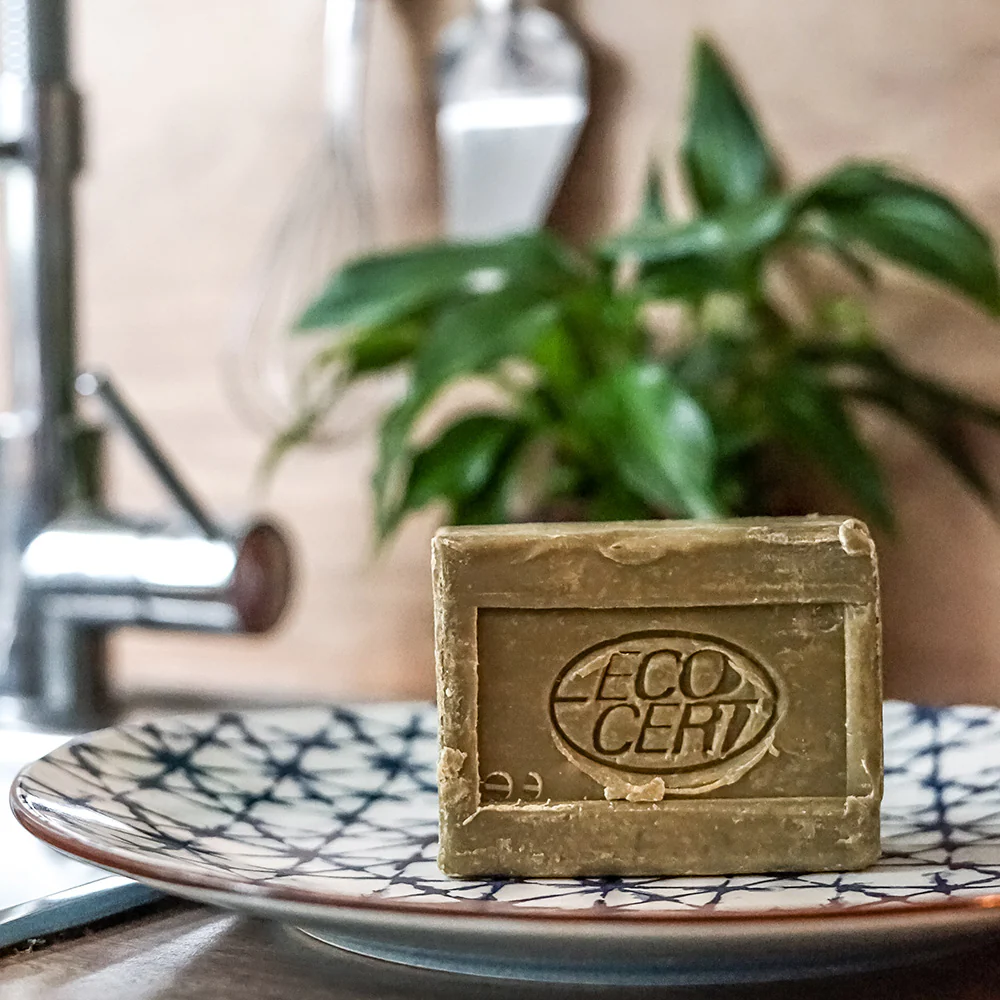 Dish soap featuring traditional Marseille soap with added baking soda & aloe vera extract. Washes away stubborn grease while moisturizing your hands. ECOCERT natural detergent certified. Sustainable packaging using FSC-certified paper.
